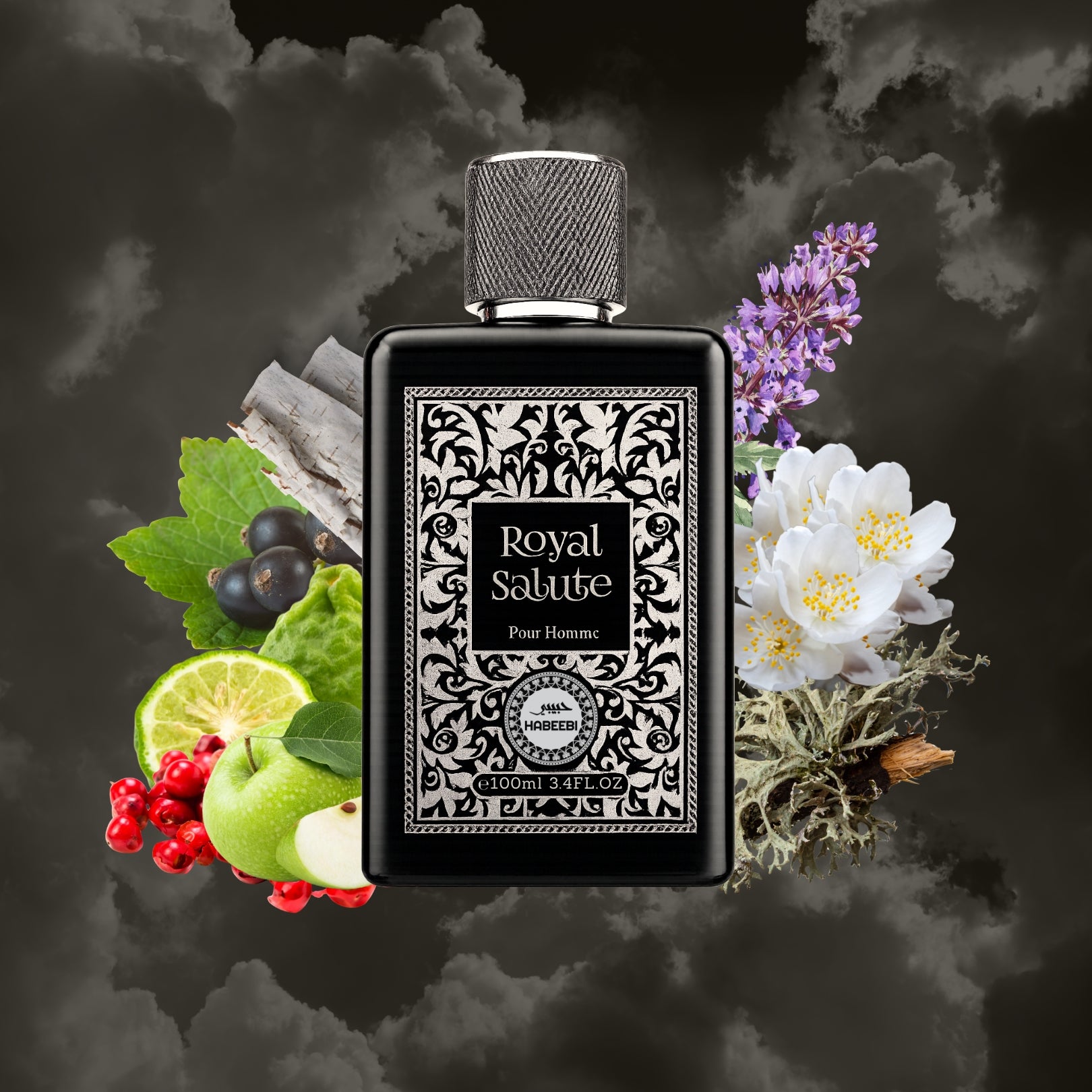 Command attention with Royal Salute, a fragrance crafted for those who embody strength and sophistication. It begins with a bold burst of black currant, bergamot, pink pepper, and crisp apple, creating an energetic and refined opening.