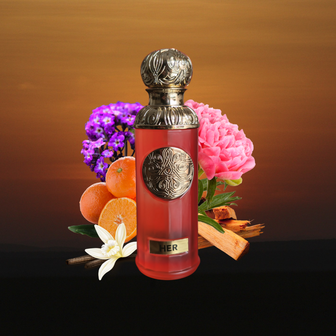 Celebrate feminine elegance with Her, a fragrance that blends soft florals with sensual warmth. It opens with the radiant brightness of tangerine, wrapped in delicate orchid and heliotrope for a luminous floral heart.